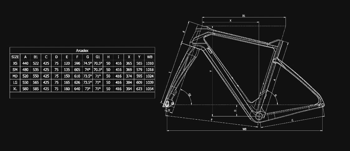 - Frameset: Arcadex Carbon, 1.5″ headset, zadelpen diam. 31.6mm