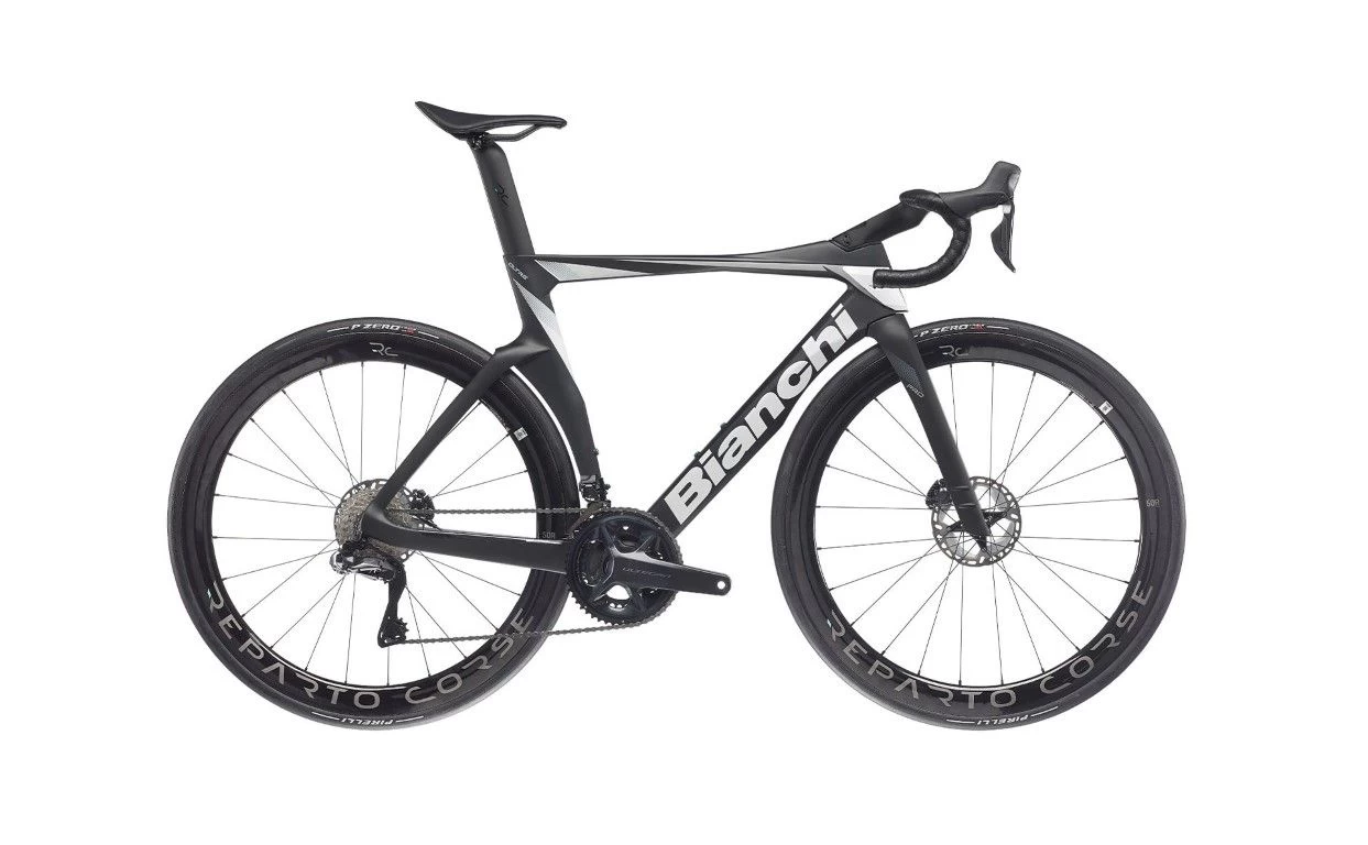- Frame: Oltre PRO carbon w/Bianchi CV System aero shop, alleen elektronische drivetrain, balhoofd 1.1/4″-1.1/4″, BB-PressFit 86,5x41mm, geïntegreerde zitklem, voor flat mount remklauw, interne kabelgeleiding voor schijfremmen, steekas 12x142mm