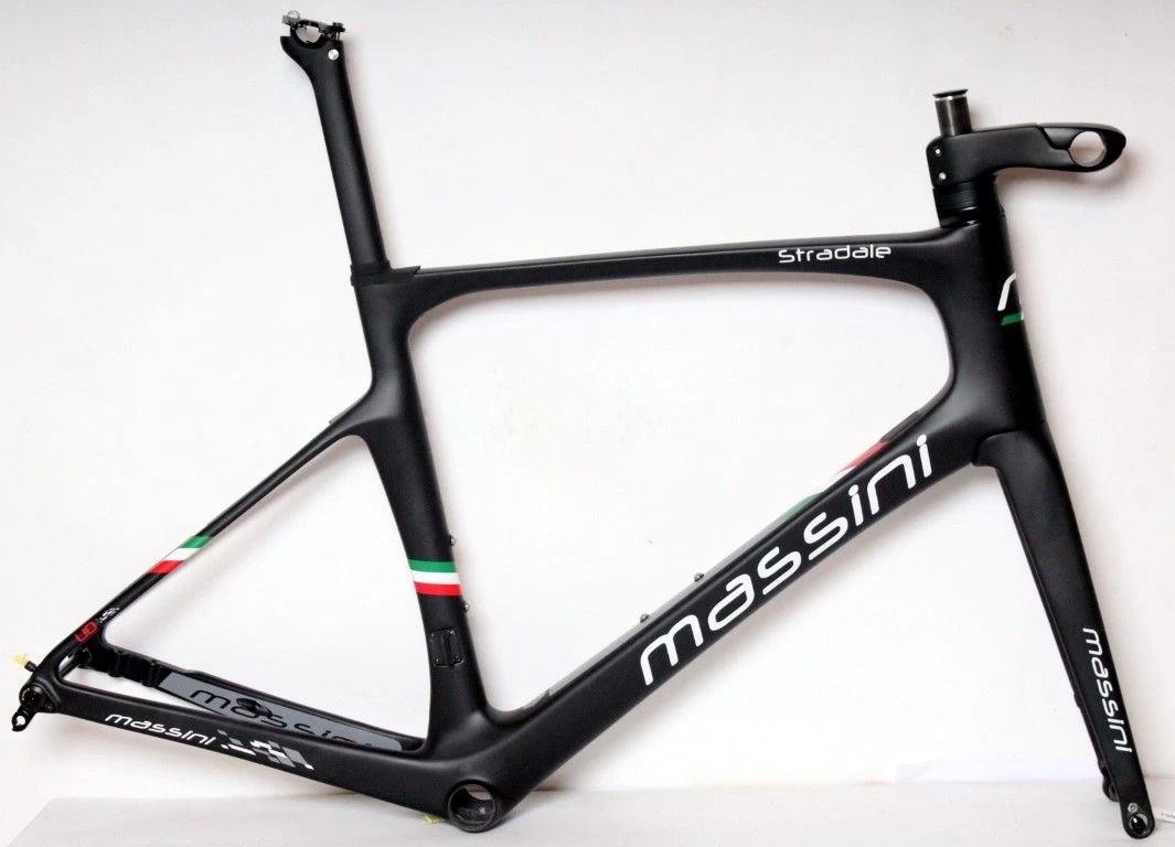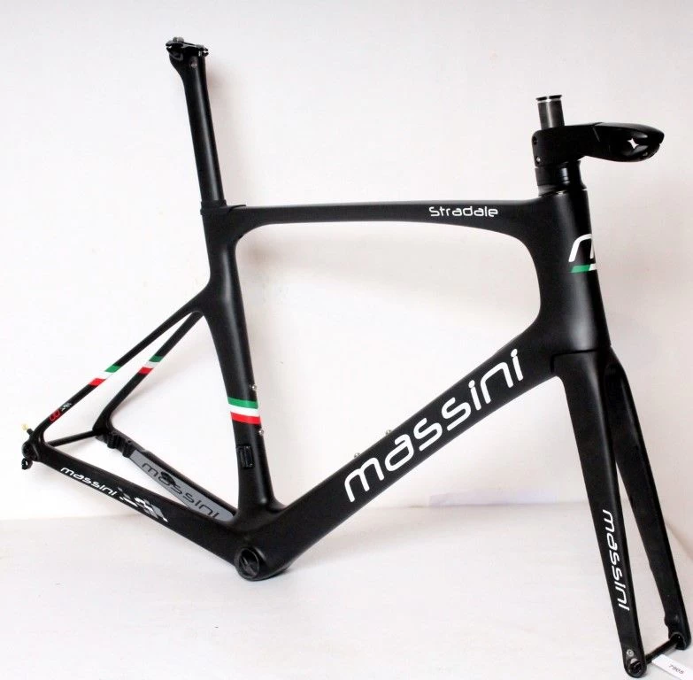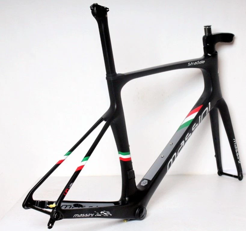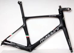 Dit mooie Massini Stradale disc frame is een monocoque carbon frame gemaakt om op te racen op de weg. Door gebruik te maken van schijfremmen is het mogelijk om snel en direct te kunnen remmen. Verder ziet ie er ook nog eens erg stoer en robuust uit door de mooie kleurstellingen, mat zwart of glossy rood, en de opvallende decals op het frame zoals de italiaanse vlag en de Massini logo’s.