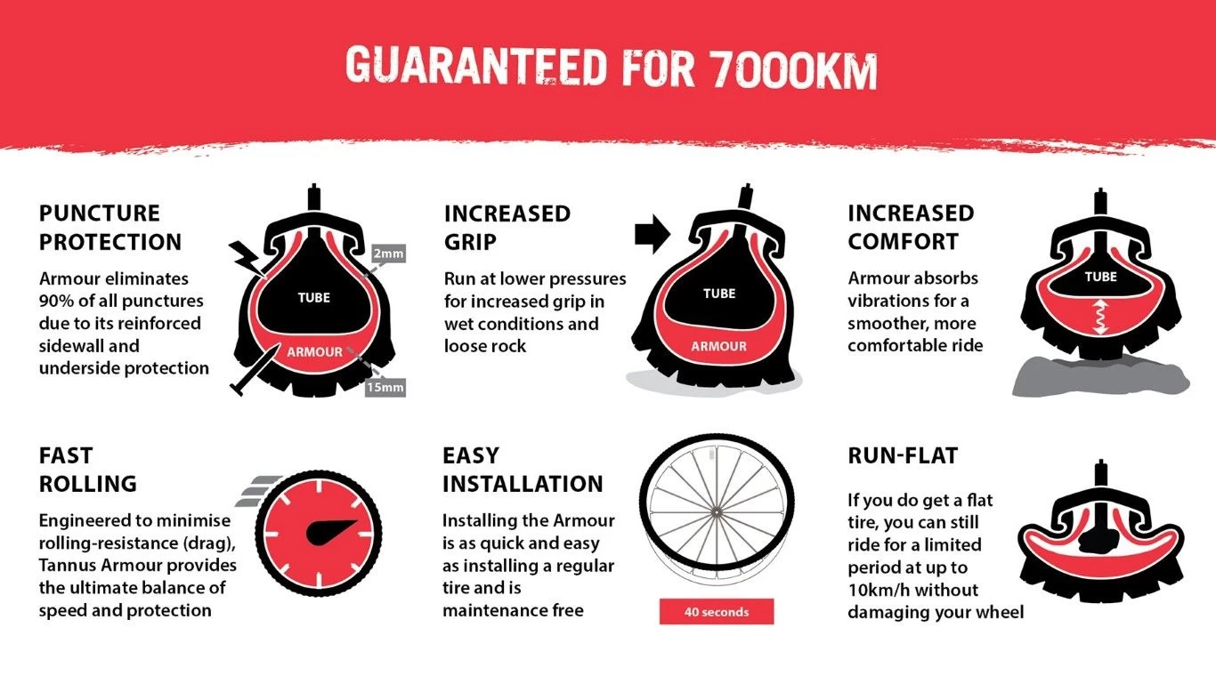 Tannus Armour is het ultieme in anti-lekbescherming en prestaties op alle niveaus en alle stijlen van rijden. Zittend tussen de buiten- en binnenband biedt de Tannus Armour 15 mm lekbescherming aan de bovenkant en 2 mm zijwandbescherming tegen scherpe voorwerpen en stenen.