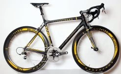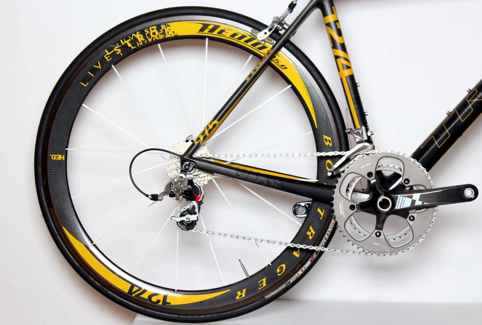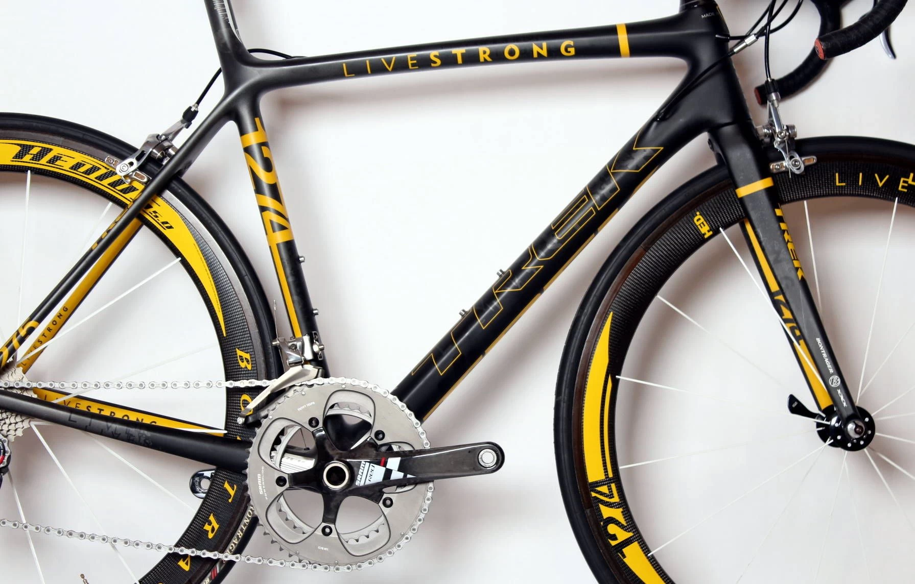 Deze zeer opvallende en oogstrelende racefiets werd gemaakt door Trek’s Project One. Bij dit frame werden geen stickers/emblemen gebruikt, in plaats daarvan werden er een complexe reeks verfmaskers gebruikt, waarbij elke letter, elk logo en elk ontwerpelement op maat werd gemaakt, geverfd en vervolgens bedekt voor de volgende laag. Het kostte Trek 40 uur.